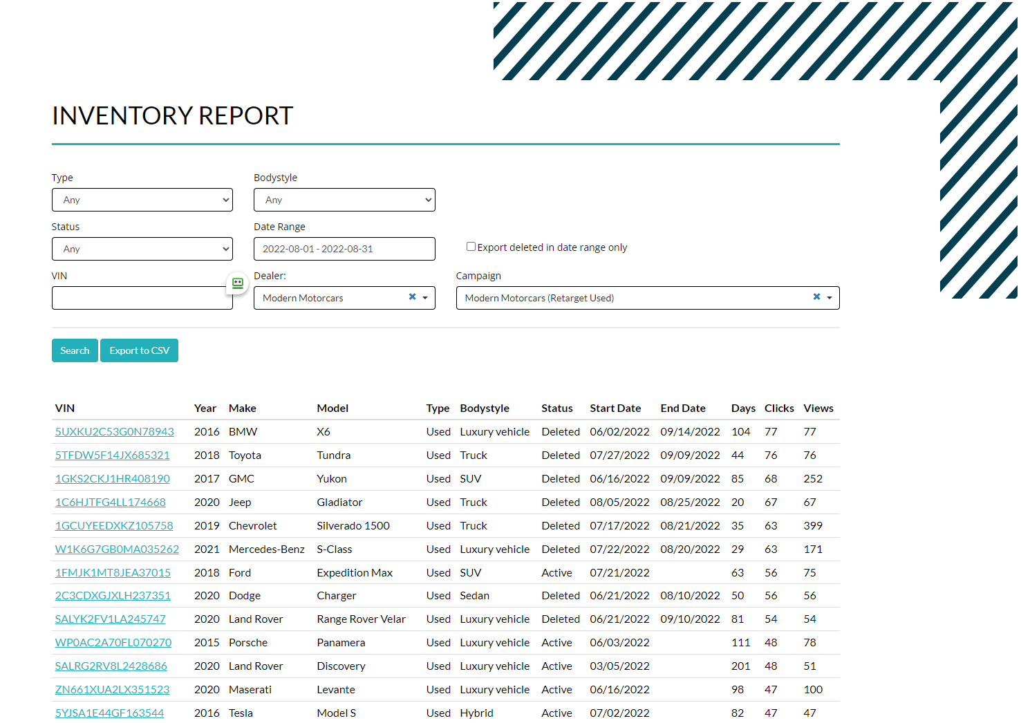 Our system will allow an agency to pull a report of every VIN on their lot and also give the agency info like the number of days the car has been on the lot, number of clicks on each VIN from our ads in each campaign, as well as "views" on the VDP page. The data can also download the report with any range of days they want to run, all from our dashboard.