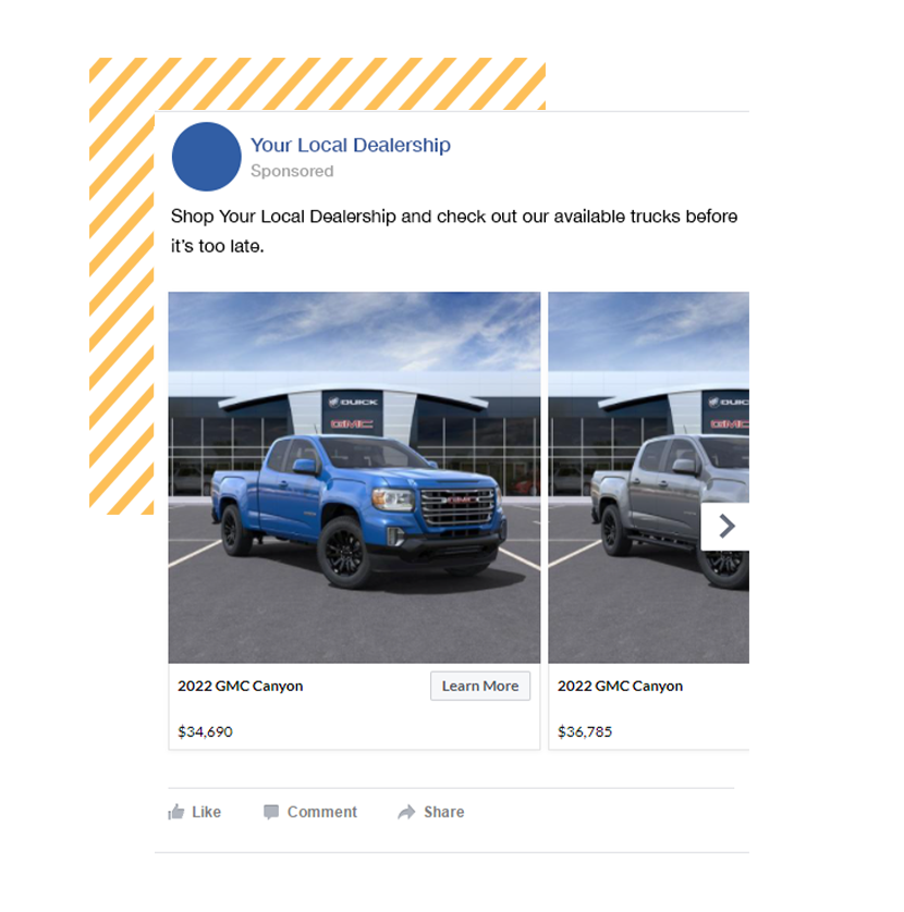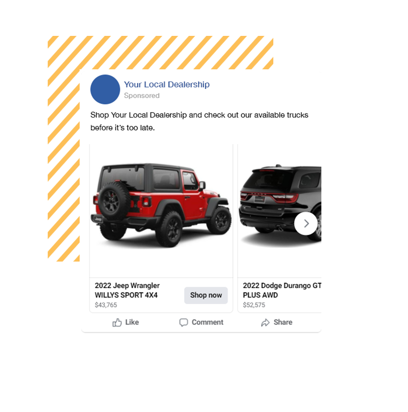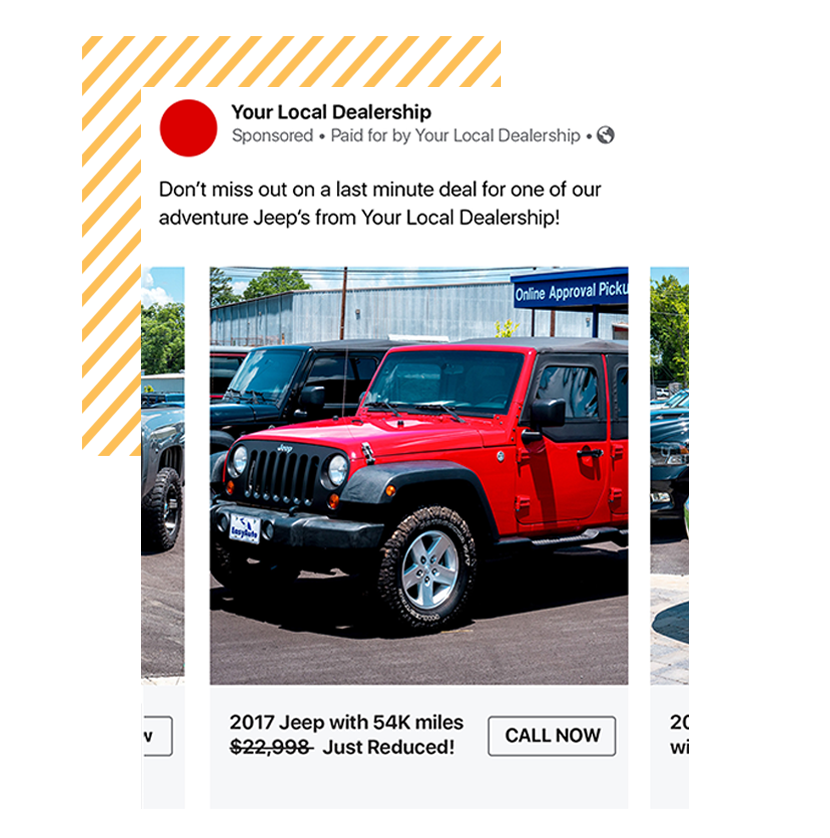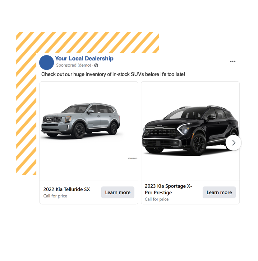 Facebook requires ads to have an image and price in order to upload the feed. SocialBot has figured out a workaround that allows us to display either mileage or “call for price” text in the same ads as ones with price. This allows us to access a dealer’s full inventory. Typically, in most ads someone choses a default option (price, mileage, or call for price) under the image but our system can display price and if price isn’t available display something else like mileage or call for price.